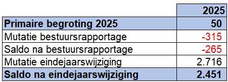 De eindejaarswijziging laat de volgende ontwikkeling zien ten opzichte van de begroting 2025 na bestuursrapportage en drie separate raadsvoorstellen. Waarbij het primaire begrotingssaldo eindigde met een positief saldo van € 50.000, was dit na de mutaties van de bestuursrapportage een saldo van € 265.000 nadelig. Uiteindelijk geeft de eindejaarswijziging een totaal saldo van € 2.716.000 voordelig, inclusief toevoegingen en onttrekkingen aan reserves.